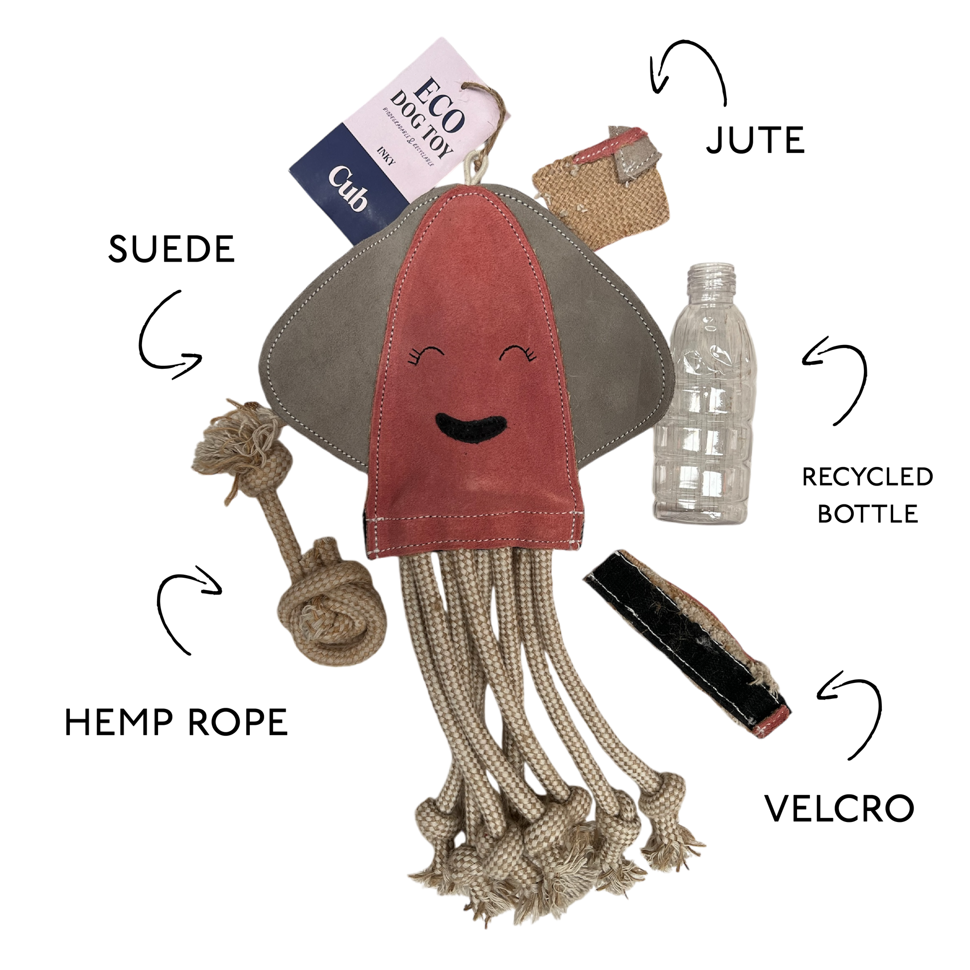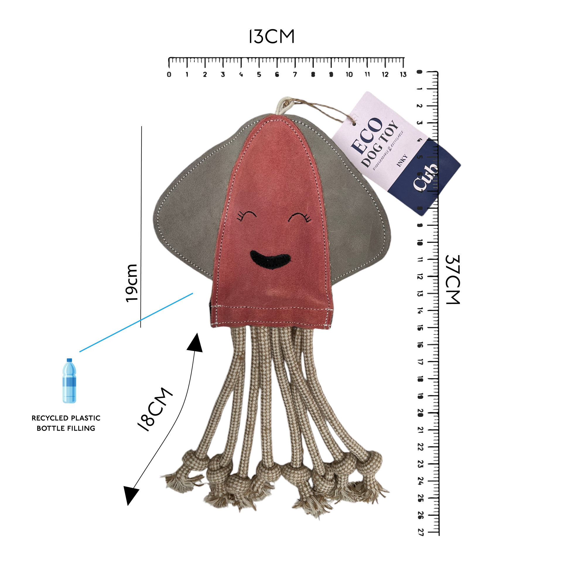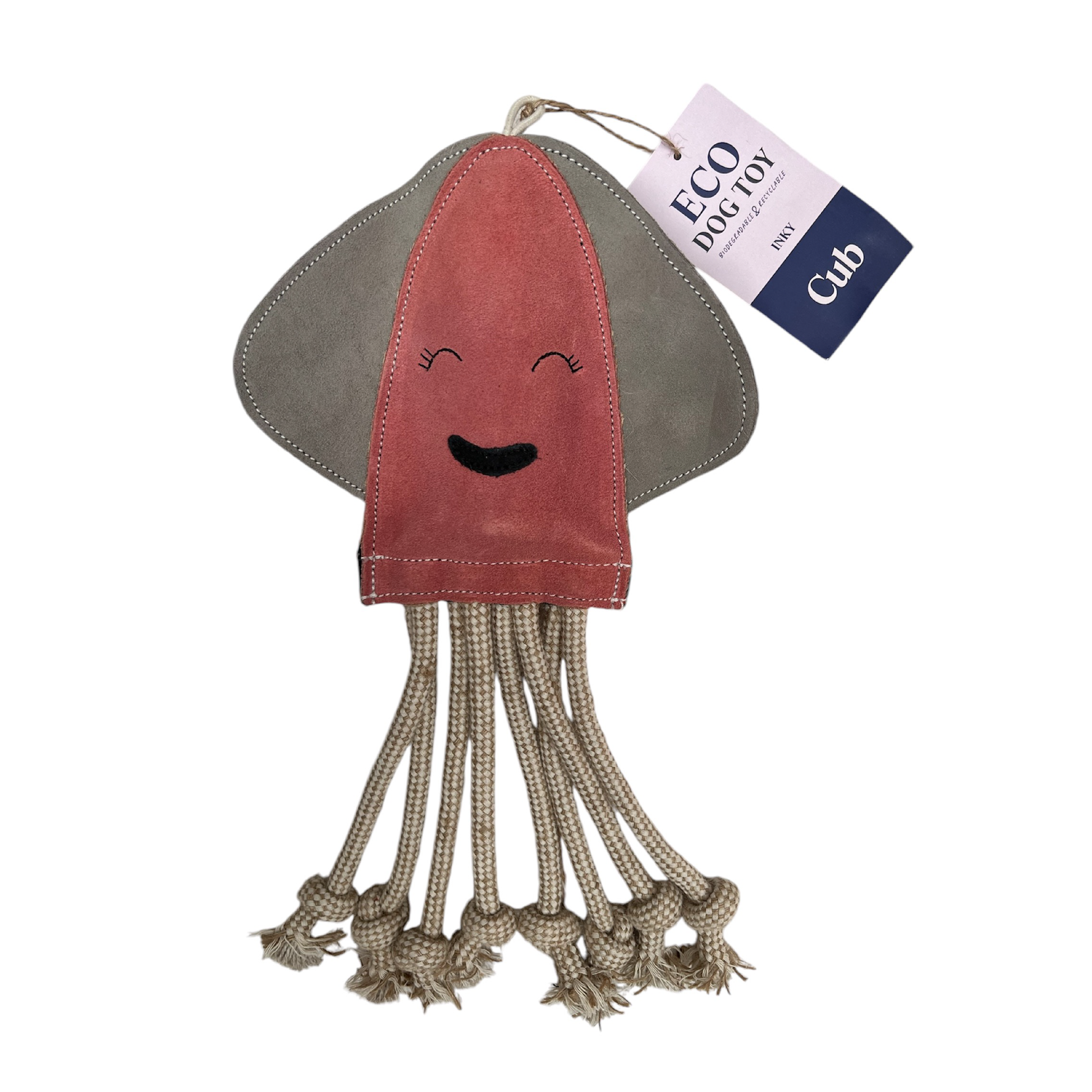 Treat your four-legged friend to an eight-legged 'Inky' Squid dog toy! The incredibly adorable toy is equipped with a recycled crinkle bottle to provide a satisfying 'crunch,' which is perfect for any canine companion that relishes toys with audible features. Alternatively, there is a Velcro fastening at the base of the squid's body to hold the recycled bottle in place, meaning this could easily be swapped out for delectable treats or a squeaker to pique your pup's interest even more! What's more, the rope tentacles make this toy great for a game of tug-of-war with your beloved pet. If not for your own dog, this toy is also a great gift idea for friends who have a woofing best friend.